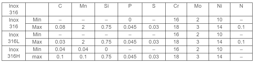 Thành phần hoá học Inox 316/316L: