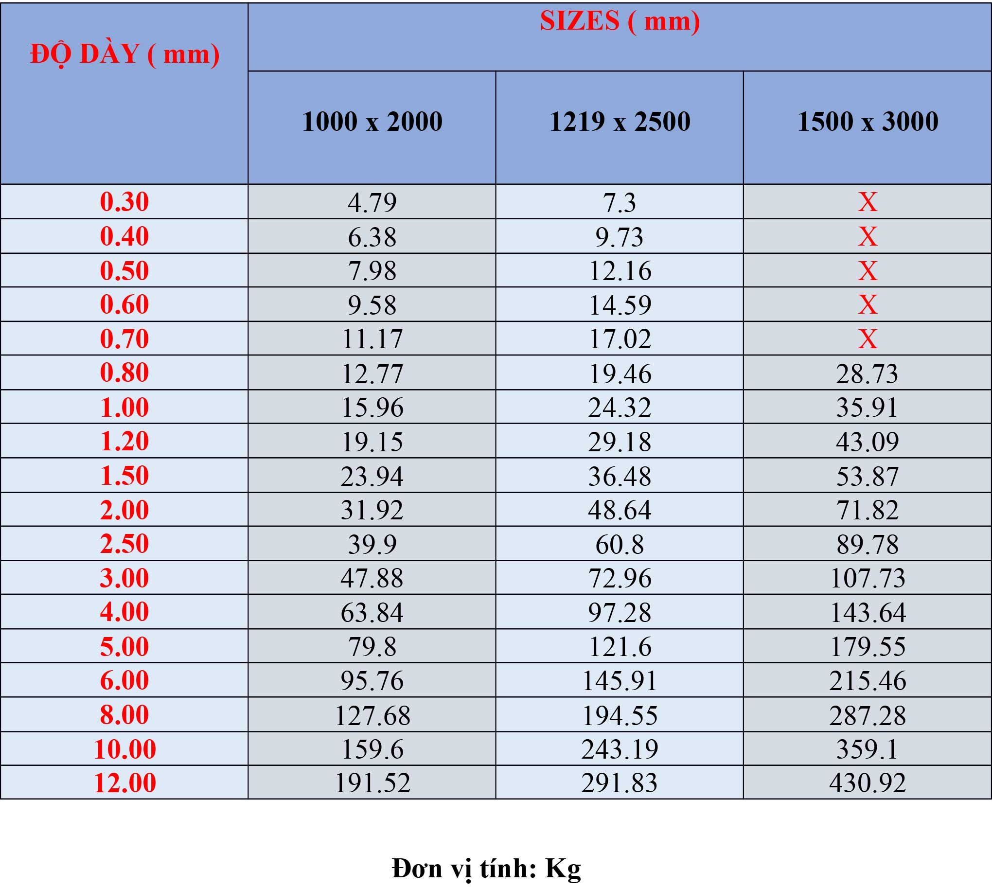 Bảng trọng lượng tấm inox 316/ 316L:
