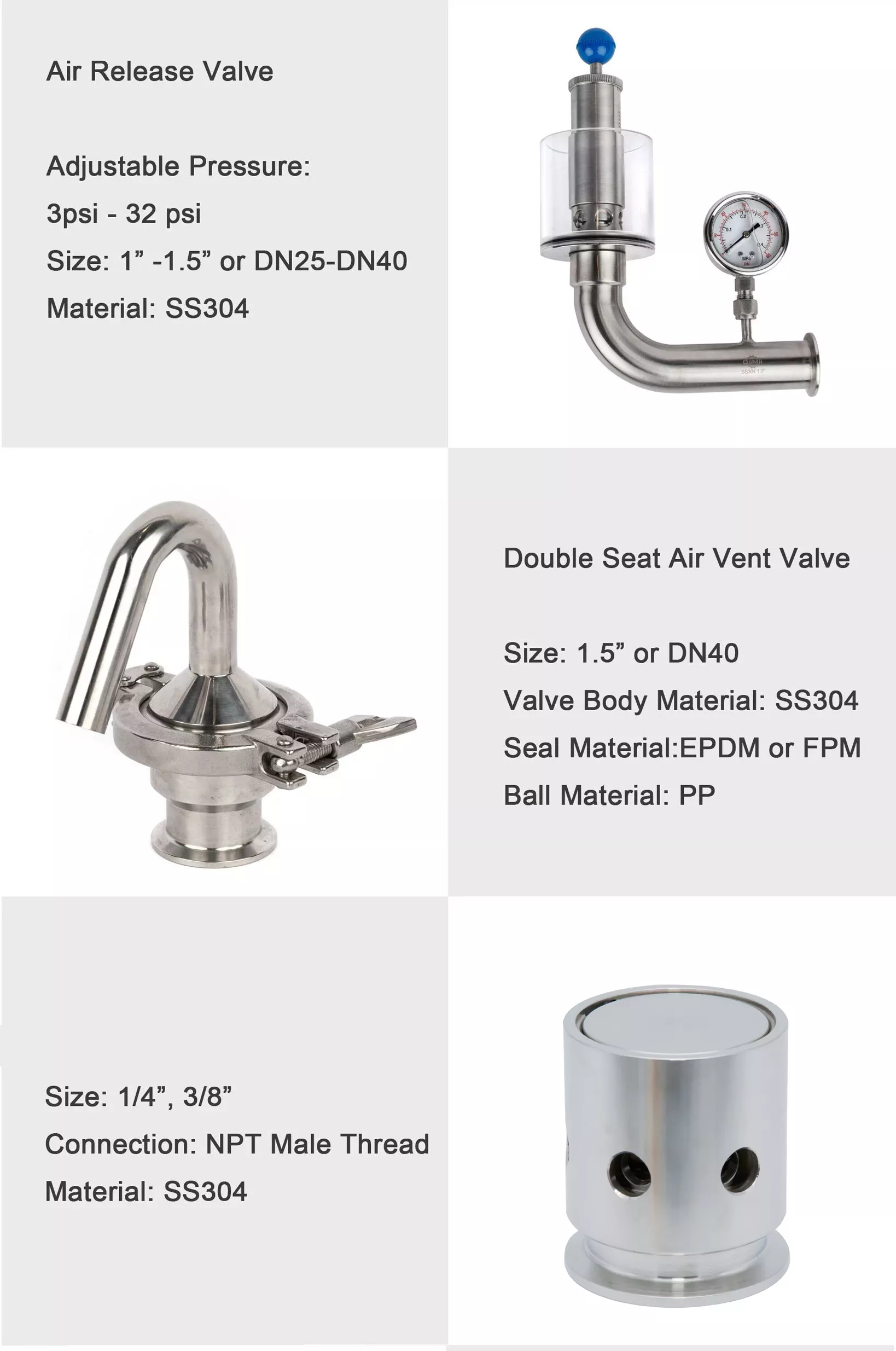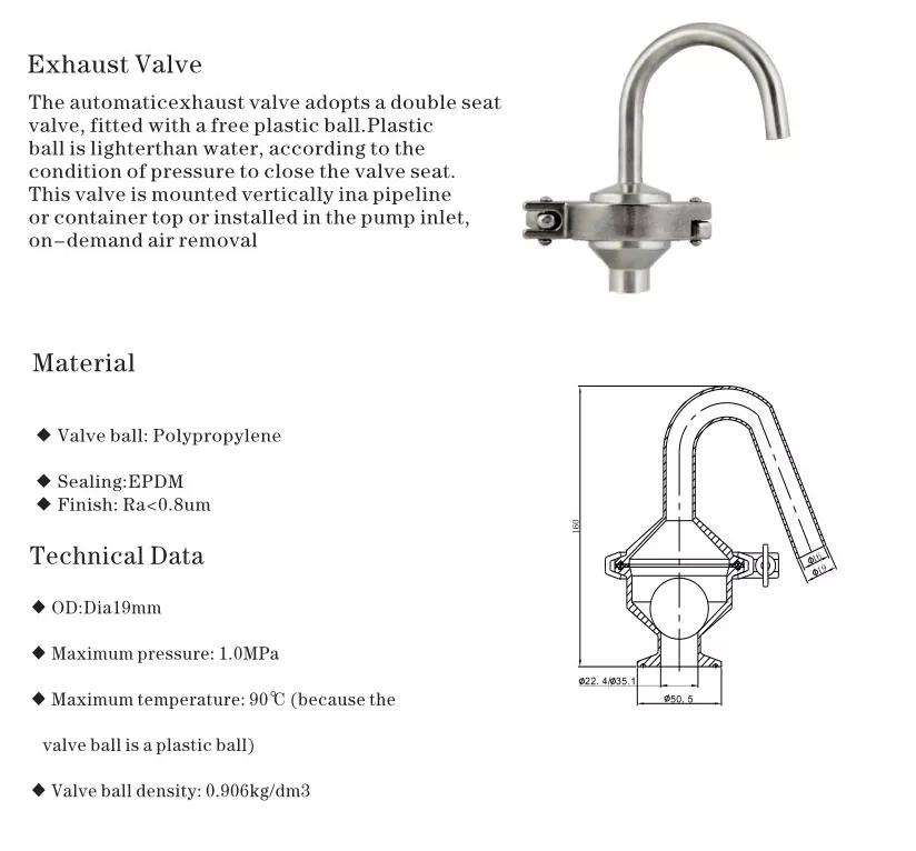 This series exhuast valve is the sanitary stainless steel valve, It’s safety sesign make it prtect the equipment, So it installed in the returen circuit of discharge pressure, It’s good for safety protect function in pipeline, Pump, device, storage tank. Extensiveloy use to food, beverage, dairy, Beer industry etc.