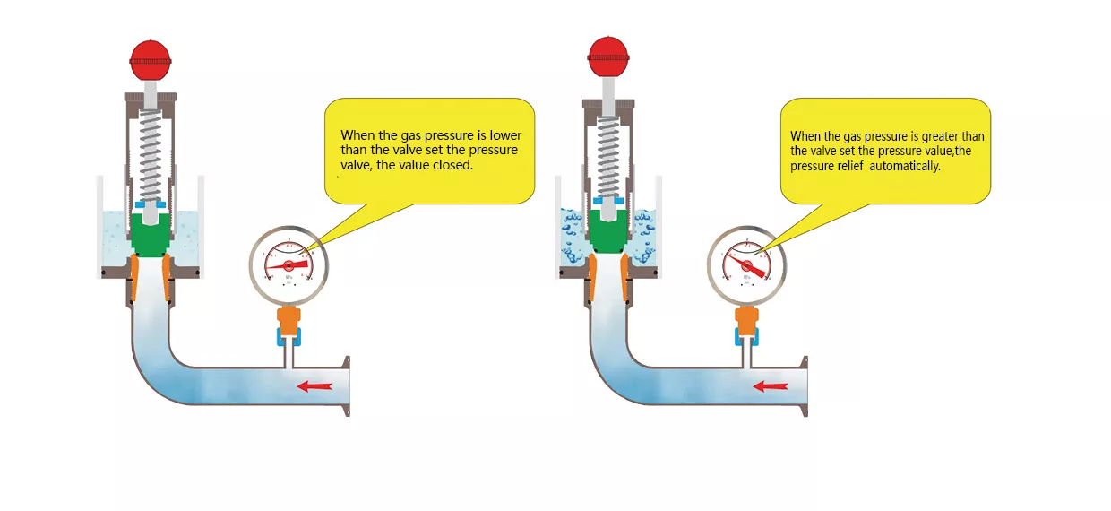 The valve controls the pressure by adjusting the spring. When the pressure in the tank is bigger than the valve setting pressure, the valve seat automatically turns on, the pressure in the equipment system is released, and the beer fermentation is effectively processed. The tank is no more in high pressure, which may cause danger. The pressure can be set according to the user’s need. The valve has a glass, which can be filled with water. It can be seen when gas comes out. A spare pressure gauge can be available.